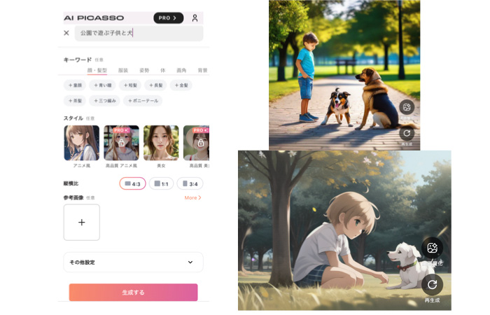 例えば「公園で遊ぶ子供と犬」とテキストを入力して追加したいキーワードや必要に応じてスタイルを選択すればすぐにイラスト生成が出来ます。